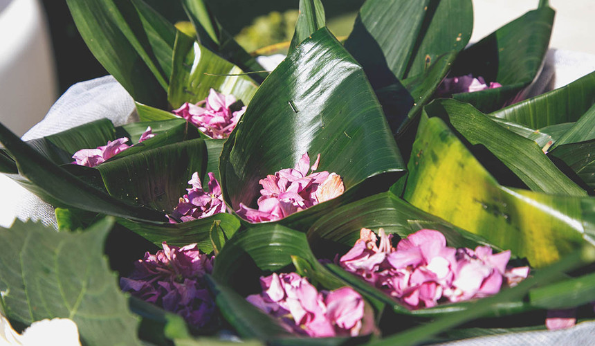 Il tema di tutto il matrimonio è stato il tropicale. Grazie agli allestimenti, distribuiti in sala e in giardino, si è vissuta una vera e propria atmosfera equatoriale. I fiori che hanno addobbato l’angolo del rito, la sala e i tavoli degli invitati sono stati tanti e coloratissimi: ad esempio le ortensie, il papiro, i fiori di banano, le sterlizie e le mostere e le anthurium, ovvero grandi fiori carnosi principalmente rossi con un pistillo centrale. Dettagli particolari che hanno arricchito l’allestimento, sono stati dei piccoli pappagallini, inseriti in cilindri di vetro e sparsi per la sala. Sul tavolo della celebrazione sono state poste delle grandi bocce di vetro contenenti fiori tropicali che hanno realizzato la cornice perfetta per l’unione degli sposi. I tavoli, con i nomi dei fiori, sono stati apparecchiati con sobrietà ed eleganza; come segnaposto è stata utilizzata una foglia verde e un bigliettino di ringraziamento da parte degli sposi. Anche lo sweet corner e la torta sono rimasti fedeli al tema tropical: completamente bianca e magistralmente adornata con orchidee e foglie tropicali.